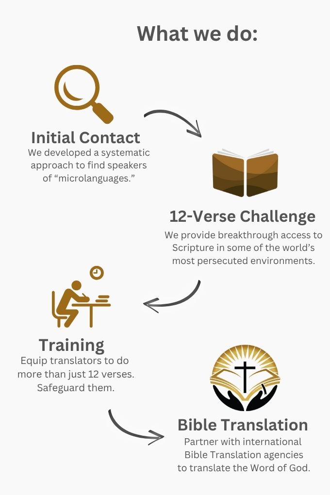 Our vision is to translate this one verse for every language. We pray that it serves as a starting point for future translation work to begin., and a gauge for community interest in Bible Translation.